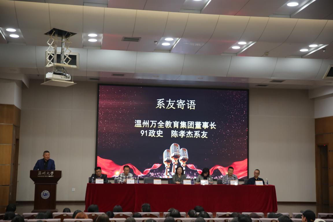 2020年11月14日,经前期协调沟通,温州万全教育集团为德赢ac米兰官方合作vwin捐资设立的“瑞杰文学奖”签约仪式在德赢ac米兰官方合作vwin北校区信息楼报告厅隆重举行。出席仪式的有德赢ac米兰官方合作vwin历史系校友温州万全教育集团董事长陈孝杰、德赢ac米兰官方合作vwin校友办主任陈宏毅、人文党委书记吴静、副院长郑春生、副书记魏一、系主任尤育号和历史系发展基金会会长刘建国,以及历史系全体师生。