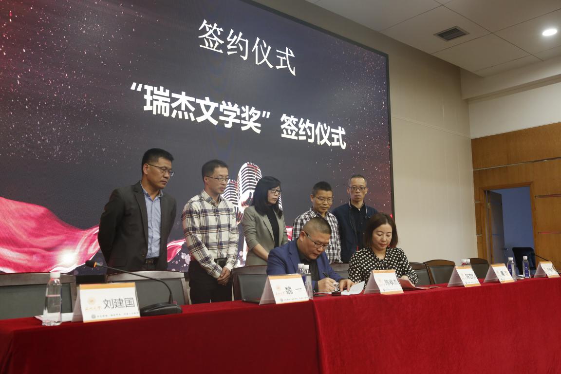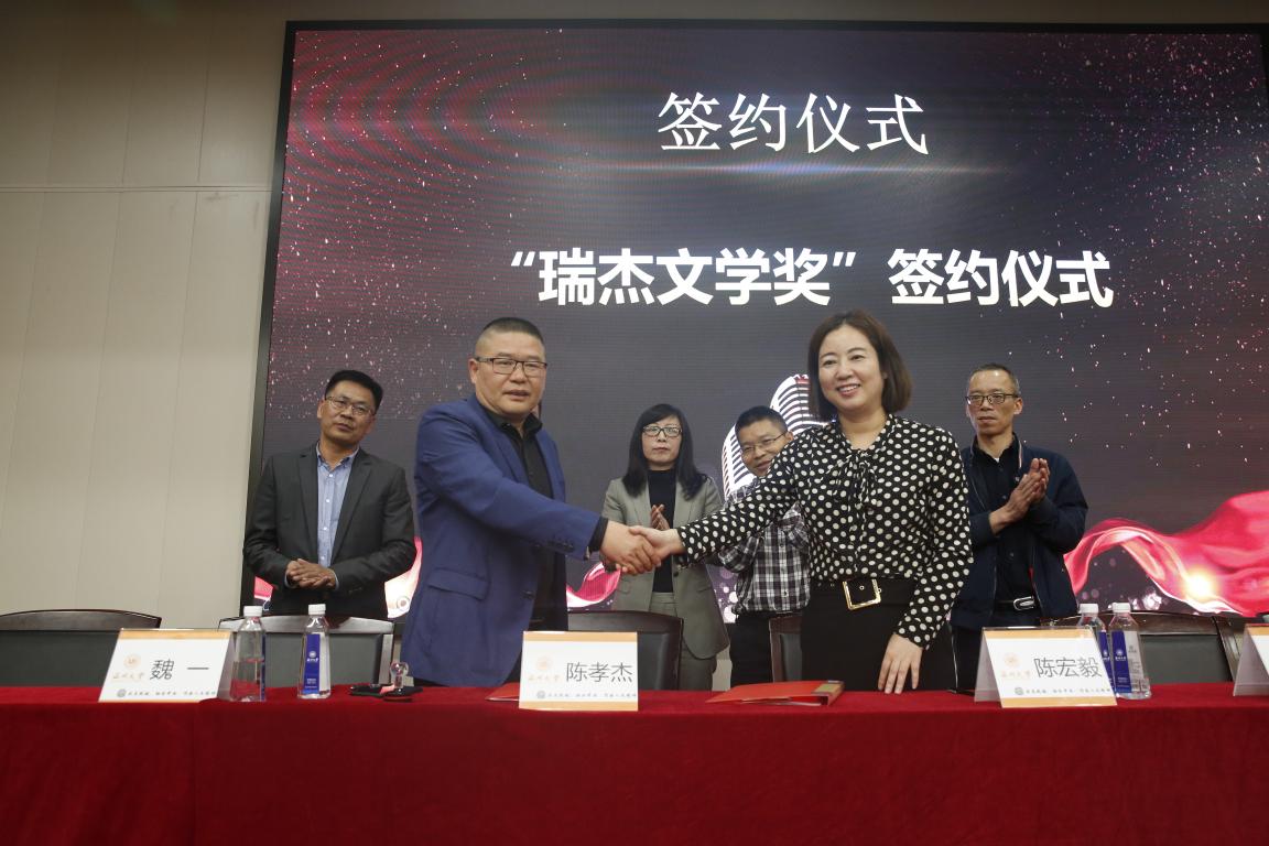 此次“瑞杰文学奖”是德赢ac米兰官方合作vwin历史系校友陈孝杰先生为支持德赢ac米兰官方合作vwin教育发展,鼓励德赢ac米兰官方合作vwin学生奋发向上,大胆追求自己的文学梦想,促进学生专业能力的发展,同时激发出众多文学爱好者们强烈的创作激情特捐资15万元设立“瑞杰文学奖”专项奖学金,用于奖励德赢ac米兰官方合作vwin具有文学特长学生,以及推动德赢ac米兰官方合作vwin学生文学创作发展所需的资金。仪式上温州万全教育集团董事长陈孝杰与校友办主任陈宏毅共同签署了合作协议。
