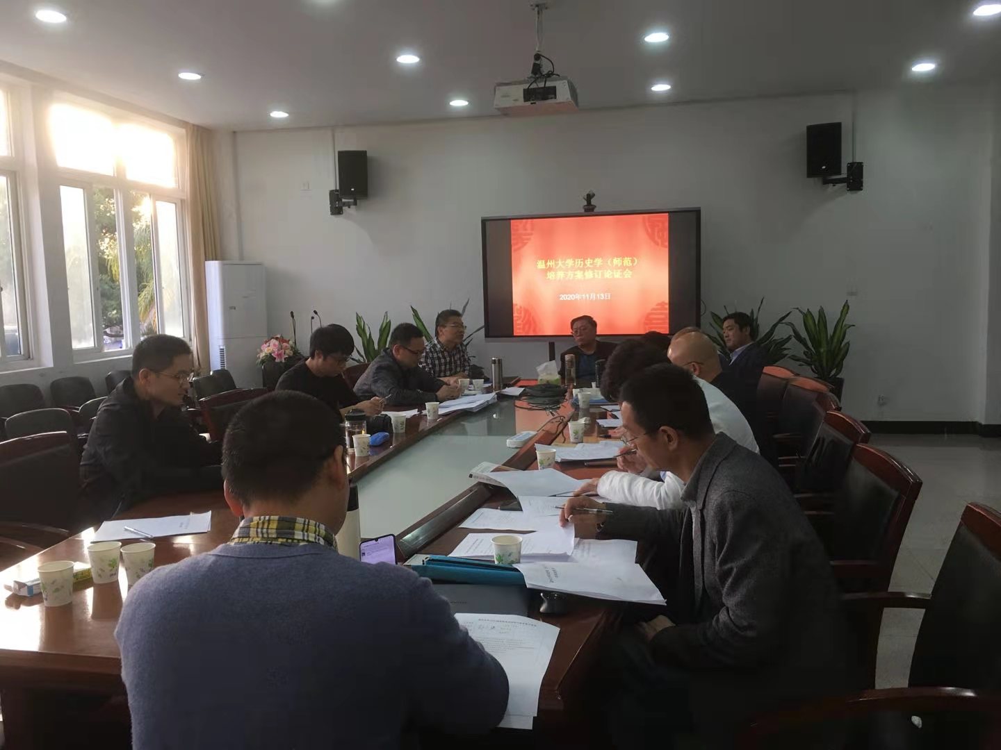 2020年11月13日下午,历史系在德赢ac米兰官方合作vwin213会议室召开历史学(师范)专业培养方案修订论证会。来自温州中学一线的历史教学名师蔡永、方军、黄静、王少莲、夏陈伟、项洪文、肖云豹、徐乃赛、赵庆东、郑小侠和历史专业骨干教师参加了论证会。会议由德赢ac米兰官方合作vwin副院长、历史专业负责人郑春生教授主持。