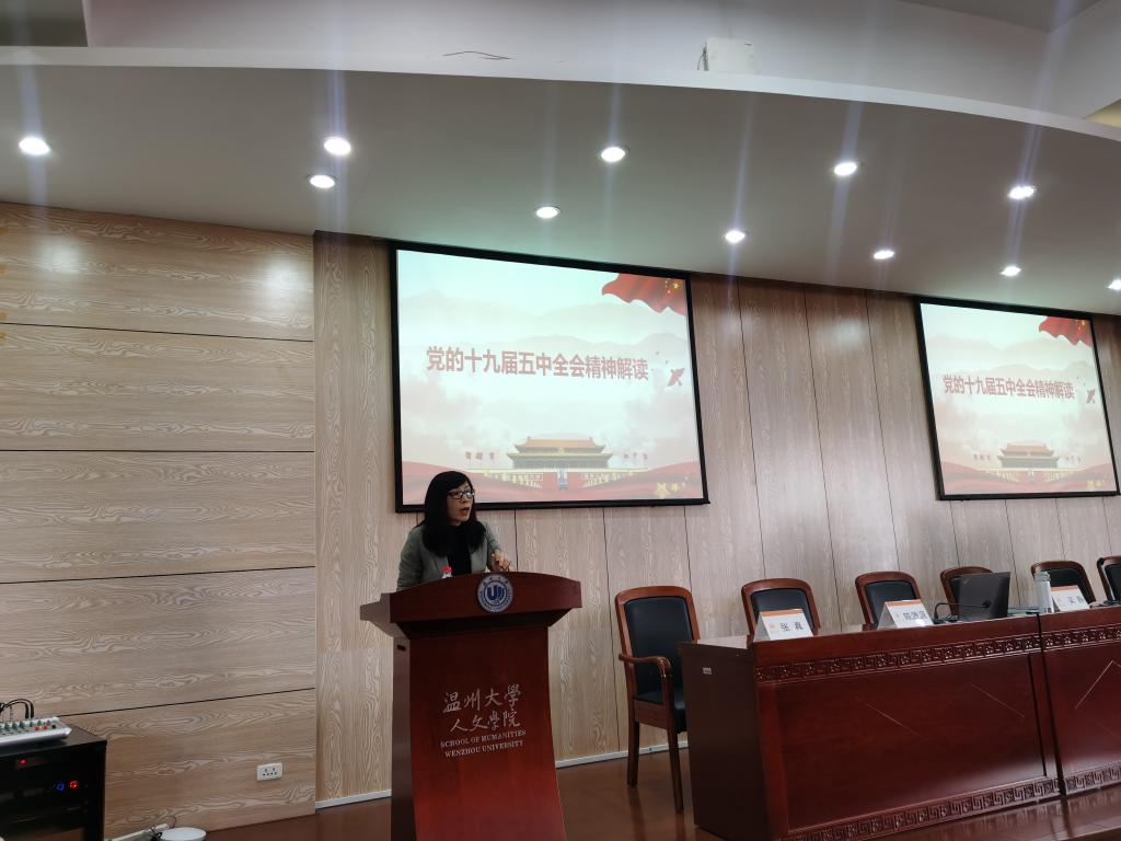 她强调指出,学习贯彻党的十九届五中全会精神,是学院党委当前和今后一段时期的重要政治任务,要分层分类、不折不扣地组织开展,同时必须与学校、学院工作实际相结合,与推进各项发展改革任务相结合,与做好年底各项重点工作相结合。她要求全院教师始终坚定“四个自信”,坚持立德树人根本任务,保证党中央决策部署在学校生根落地。