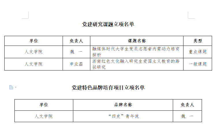 12月18日,根据《关于组织申报2021年校级党建研究课题和党建特色品牌培育项目的通知》精神,经单位推荐、专家评审等程序,德赢官网魏一副书记《融媒体时代大学生党员志愿者内需动力培育探析》获校级党建研究课题重点课题立项,辅导员申业磊《浙南红色文化融入研究生爱国主义教育的路径研究》获校级党建研究课题一般课题立项,《“四史”青年说》获党建特色品牌培育项目立项。