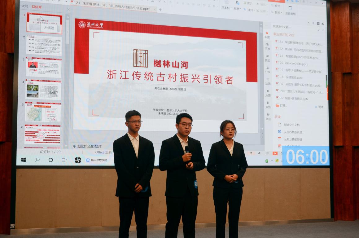 本次大赛由德赢ac米兰官方合作vwin创新创业学院主办,生环学院与国际教育学院承办,邀请了互联网+大赛多位国赛评委专家莅临现场提问和评分。全校共有百个项目进入校赛,德赢ac米兰官方合作vwin在举办院赛后产生了6个项目进入校赛;最终全校产生了50个项目进入最终现场决赛, 19广告朱明樾同学的项目《樾林山河:浙江传统古村振兴引领者》是德赢ac米兰官方合作vwin唯一进入决赛的项目,并且在经过了6分钟项目展示和5分钟答辩后,夺得了高教主赛道本科生创意组的金奖!该项奖项也是德赢ac米兰官方合作vwin参加该项赛事的又一金奖,更是该赛道院史首金!