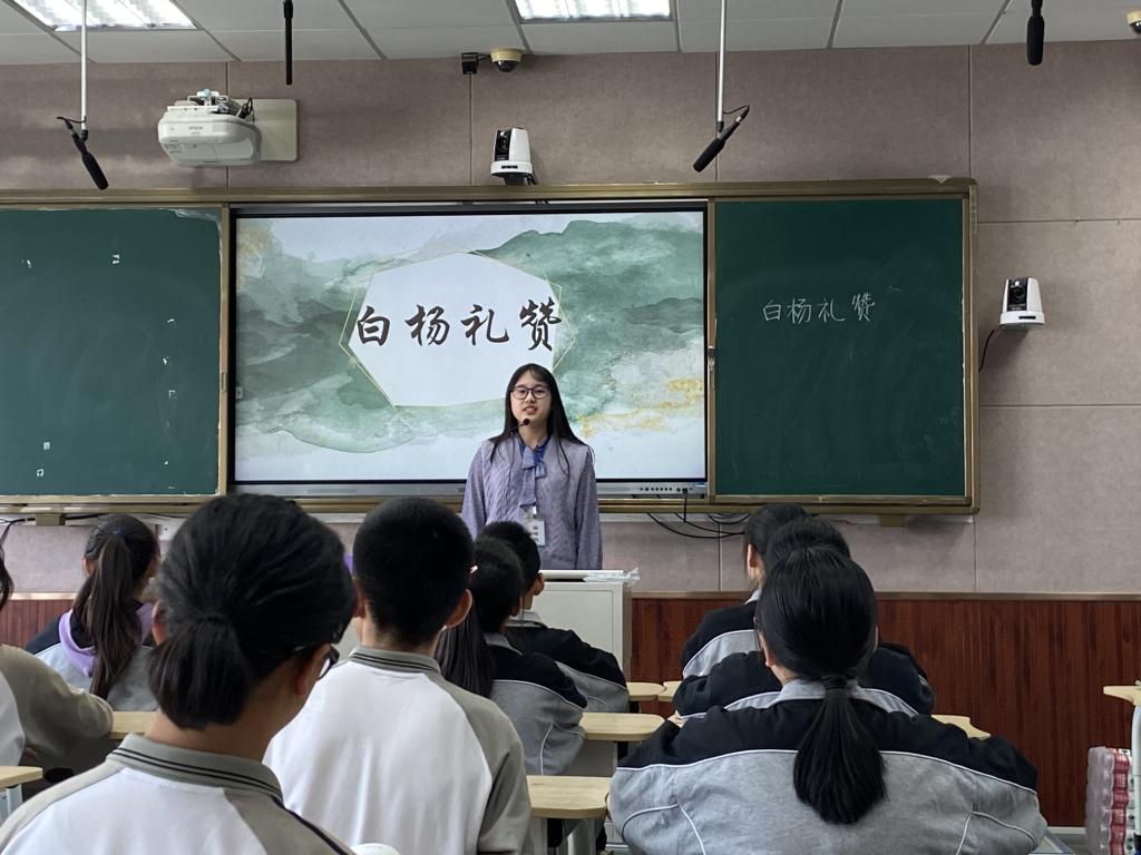 活动伊始,德赢ac米兰官方合作vwin的詹翊嘉、於婷婷两位同学同课异构,就同一篇课文《白杨礼赞》,带来两节重点不同的公开课。詹翊嘉同学重点抓住了“了解不同类型散文的特点”这一单元目标,带领学生通过这篇课文了解写景抒情散文与托物言志散文的不同。於婷婷同学则是重点抓住了“象征”这一重要的表现手法,同学生一起在探讨中了解象征的含义。两位同学从不同的重点切入,引起了学生浓厚的学习兴趣,充分带动了课堂氛围,为我们展示了两节别开生面的阅读教学课。紧接着,德赢ac米兰官方合作vwin潘思瑶、钱一帆同学分别进行了评课。两位同学根据自己的听课感受对两节公开课作出点评,赞扬她们的教学设计调动了学生的积极性并指出了一些具体的细节意见。