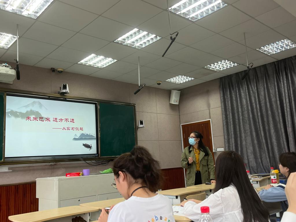 最后,周蔚然老师为大家带来讲座《未来已来,远方不远》。周蔚然老师结合自己过去的实习经历,以过来人的身份鼓励大家认真准备即将到来的应聘,还对同学们实习中的教学创新给予肯定,并提出了一些教学建议。接着,周老师分享了干货满满的考编经验,和同学们进行互动与交流,同时还讲解了自己的一些教学设计,为同学们以后的教学设计提供了新的思路。