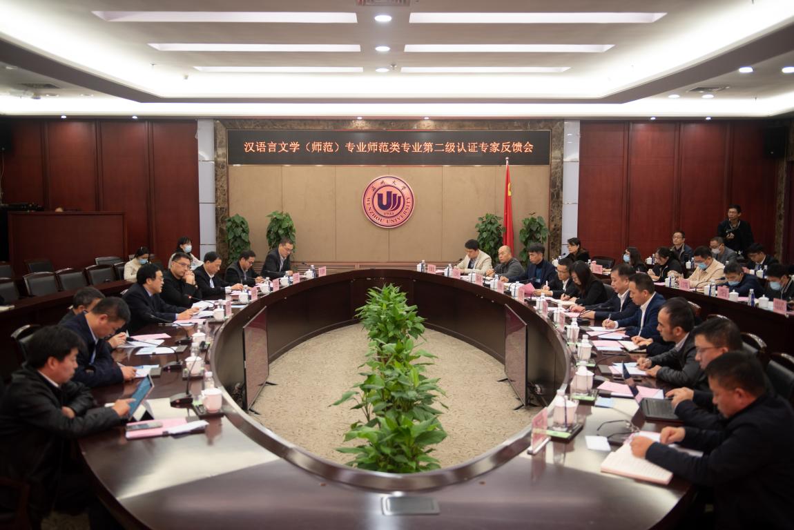 王建平组长首先代表专家组反馈了总体意见。专家组根据汉语言文学专业第二级认证标准的8个一级指标和39个二级指标开展了考查工作,期间组织各类工作会议3次,听课看课10节次,调阅各类课程试卷和考试分析报告10余门、1100份,调阅各类实习报告54份、毕业生毕业论文50篇,访谈校领导、职能部门负责人、专业负责人和管理人员27人次、专业教师与学生31余人次,访谈用人单位和校友代表20余人次,各类座谈会5次、实在走访校内外教育实践基地3家。他充分肯定了专业的优势和特色,对专业的毕业生发展状况,教育情怀涵育,社会实践锻炼等方面给予了高度肯定,也指出了专业在教育实践内容体系不完整、重点环节质量监控有缺失等问题。接着王组长和张岩泉、丁连生、赵一仑、王长旺等专家分别针对各自负责的培养目标、毕业要求、课程与教学、合作与实践、师资队伍、支持条件、质量保障、学生发展等全部八个一级指标的考查内容进行了剖析,重点指出了存在的问题并提出了相应的改进建议。