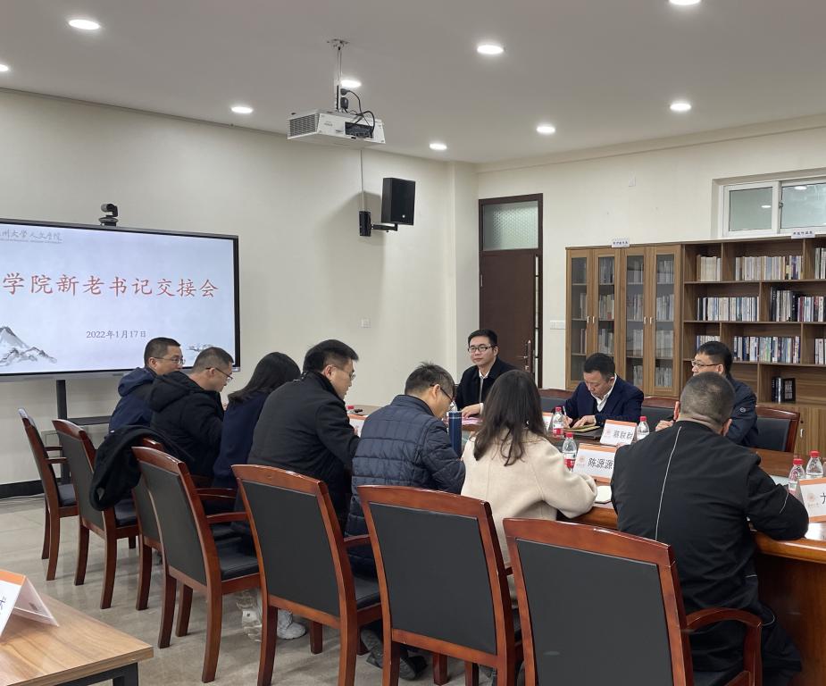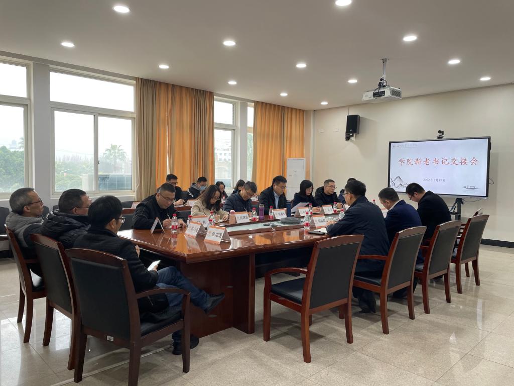 2022年1月17日,德赢官网在人文楼213会议室举行学院新老书记交接会,会议由孙良好院长主持,校党委书记谢树华、党校办主任蔡联群、学院新书记江秀景、学院班子成员、各支部书记、各科室负责人、院工会主席参加会议。