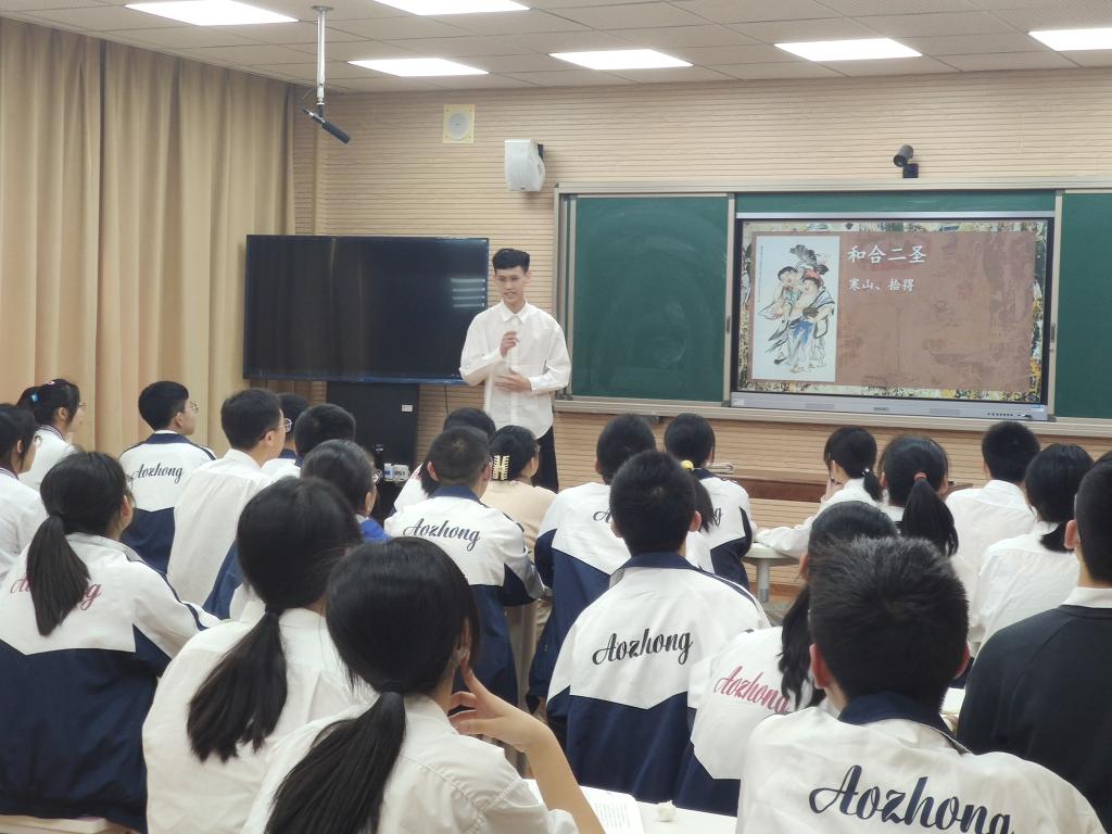 第一位进行汇报是李业老师,李业老师的主题是“和合共生——‘和合文化’望时代潮流”,采用台州天台宗的和合文化,以意想不到的方式导入本节课。以“合”促“和”,打开格局,顺应和平发展合作共赢的时代潮流。在本节课结束之际首尾呼应“悟得长生理,日月为邻伴”,给本节课画下一个完美的句号。