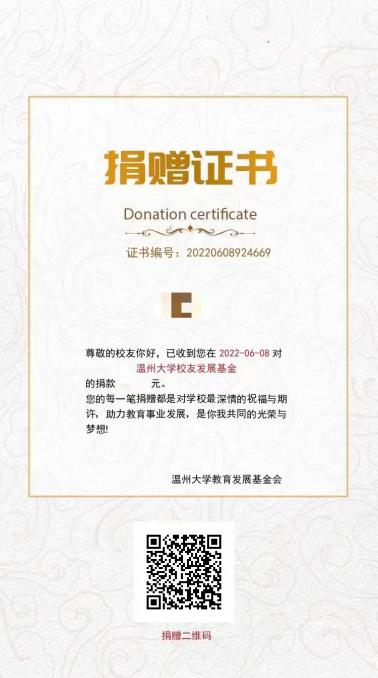 捐赠者将获得德赢ac米兰官方合作vwin教育发展基金会颁发的电子版捐赠证书。