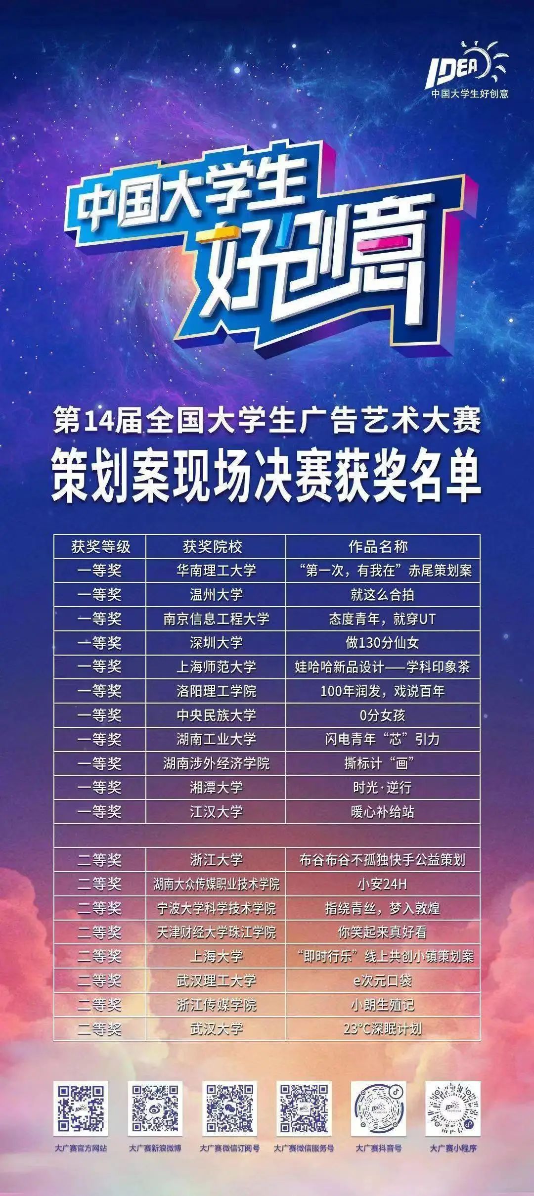 再次恭喜杨罗霏、杨琪、杨星、赵赛金四位同学斩获全国大学生广告大赛策划案类一等奖。愿诸位学子以他们为榜样,秉持“十年磨一剑”的精神,博观而约取,厚积而薄发,收获绚烂青春,成为自己的无冕之王!
