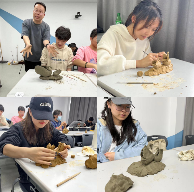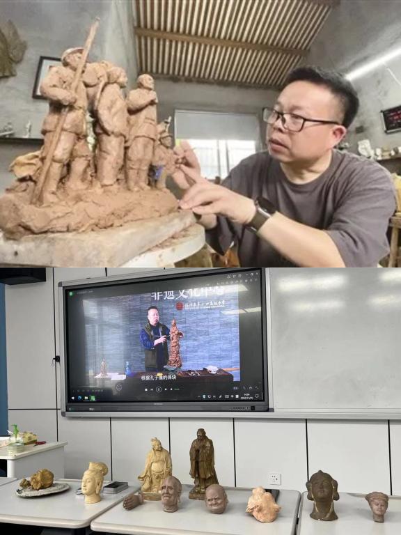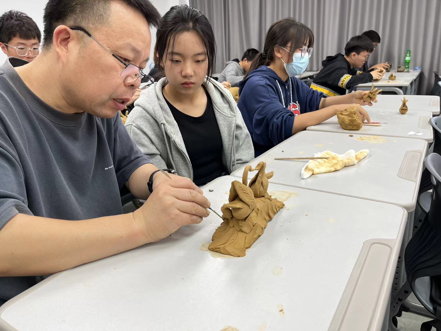 一个完整的泥塑作品要先进行创作构思,再绘制平面草图,随后经过拉、搓、揉、捏、压、插、接等一系列工序捏制出理想的塑像。在课堂上,叶芳林老师向同学们讲述了自己与“泥塑”的“缘分”。他说,“从初学艺至今,他已经痴迷泥塑创作30多年。”近年来,叶芳林老师的泥塑作品屡屡在全国获奖。