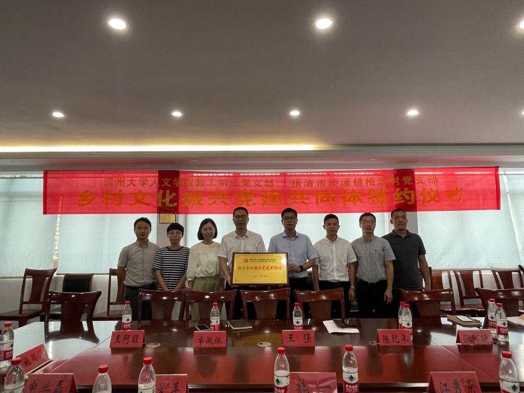 为进一步探索乡村振兴新路径,深化“双百双千”专项行动,7月19日下午,在乐清市淡溪镇梅溪村村委大楼举行德赢ac米兰官方合作vwin教工第三党支部-乐清市淡溪镇梅溪村党支部助力乡村振兴党建共同体签约仪式。淡溪镇党委书记陈纪承、淡溪镇党委委员张阿晓、梅溪村支部书记王强及梅溪村领导班子等人出席签约仪式;德赢ac米兰官方合作vwin党委书记江秀景,德赢ac米兰官方合作vwin党委副书记魏一,德赢ac米兰官方合作vwin地名研究中心主任盛爱萍,德赢ac米兰官方合作vwin中文系副主任余琼等高校代表出席签约仪式。魏一副书记主持签约和授牌仪式。