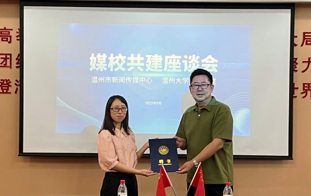 2023年9月19日下午三点,温州市新闻传媒中心与德赢ac米兰官方合作vwin举行2022级新闻与传播专业硕士研究生实践报到座谈会。温州市新闻传媒中心党委委员、副主任(副总编辑)陈伟文与德赢ac米兰官方合作vwin副院长陈源源分别代表双方进行校外导师聘书授予仪式。
