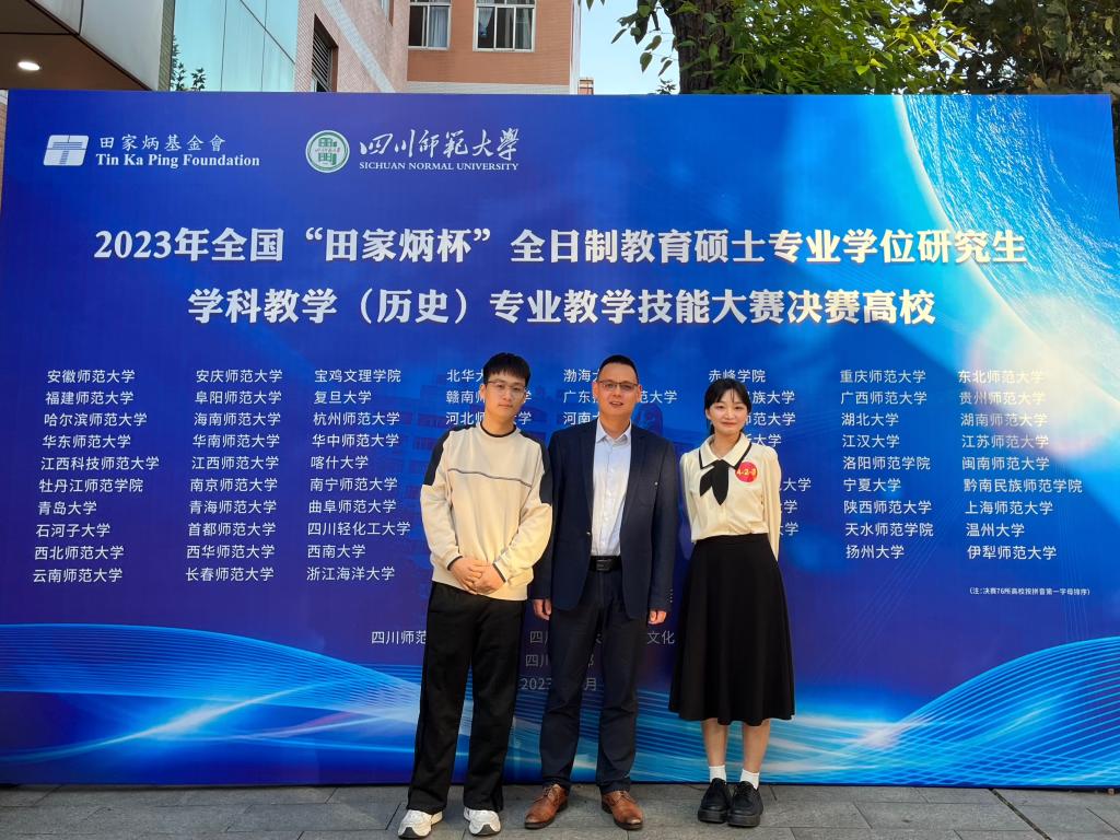 2023年10月21-23日,全国 “田家炳杯”全日制教育硕士专业学位研究生学科教学(历史)教学技能大赛决赛在四川师范大学举行。由陈勇副教授带队参赛的德赢官网学子取得了优异成绩,21级学科教学(历史)胡冷晴荣获二等奖、陈宇啸获优秀教学设计奖,蒋金崇教授获优秀指导教师奖。