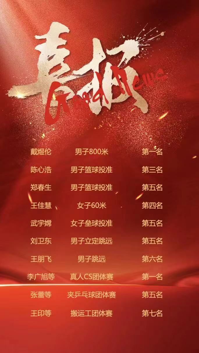 德赢官网教工积极参加各类运动项目,报名人数38人,创造历史新高。教工运动员奋力拼搏,挥洒汗水,荣获教工团体第六名及体育道德风尚奖。团体赛方面,李广旭、刘炳林、王佳慧、张丹妮、刘恭宇、王朋飞等参与的真人CS项目获得第一名,刘炳林、李红梅、张蕾、侯崇仙、王佳慧等参加的夹乒乓球项目获得第五名,王印、王鹏、王长命、刘炳林、戴煜伦等参与的搬运工项目获得第七名。个人赛方面,戴煜伦获得男子800米第一名,陈心浩、郑春生分获男子篮球投准第三名、第五名,王佳慧获得女子60米第四名,武宇嫦获得女子垒球投准第五名,刘卫东获得男子立定跳远第五名,王朋飞获得男子跳远第六名。
