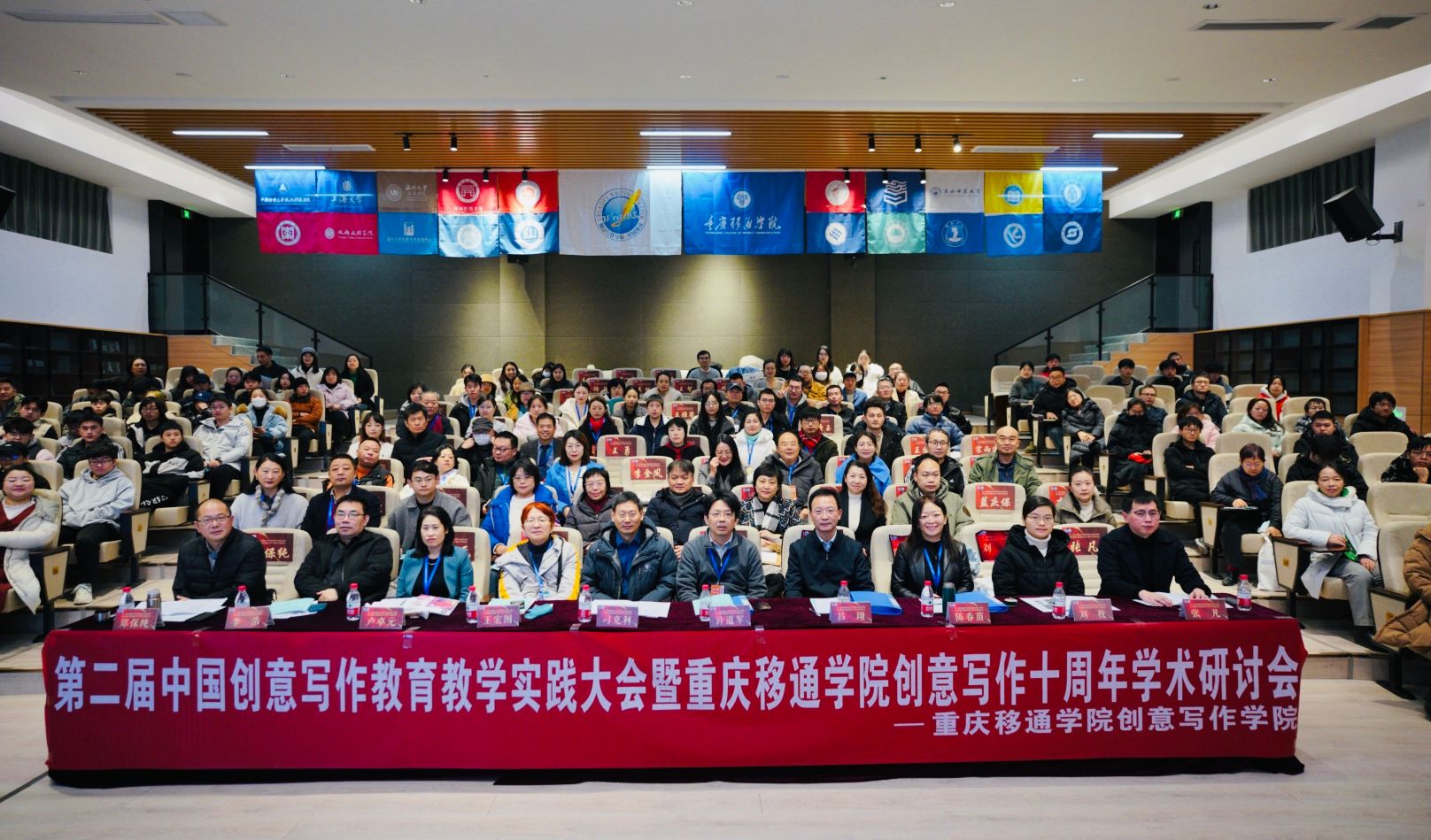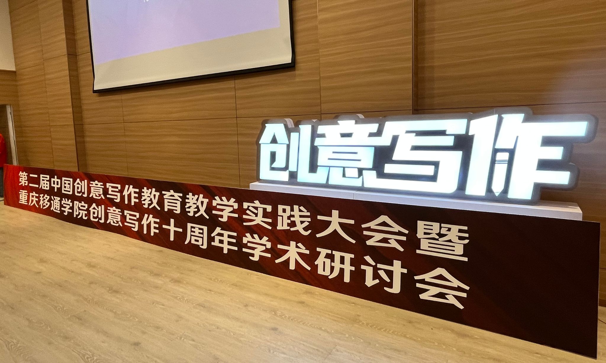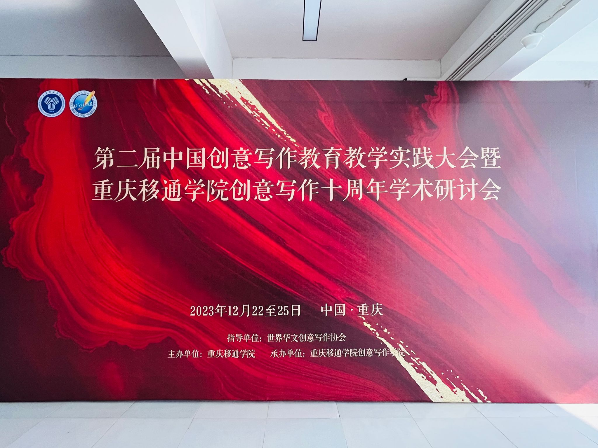 2023年12月23-24日,第二届中国创意写作教育教学实践大会暨重庆移通学院创意写作十周年学术研讨会在重庆移通学院合川校区隆重召开。来自上海大学、复旦大学、中国人民大学等40余所高校的100多位专家学者齐聚山城。德赢ac米兰官方合作vwin的李广旭博士和刘卫东博士作为温大代表以线下线上的方式出席了本次盛会,并在大会上展示了德赢ac米兰官方合作vwin创意写作教研成果,将德赢ac米兰官方合作vwin和德赢ac米兰官方合作vwin创意写作研究中心的两面旗帜悬挂在了会场。