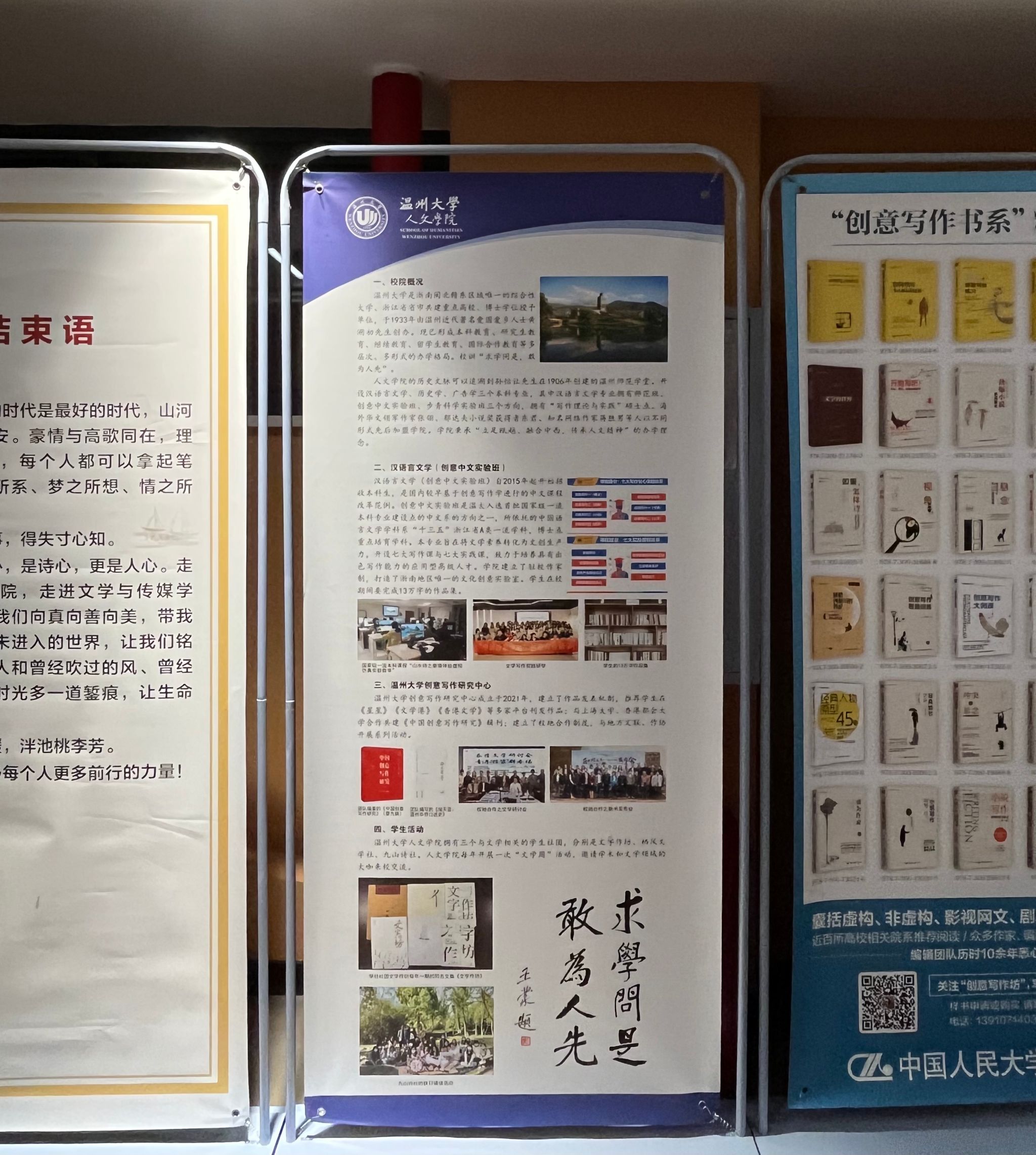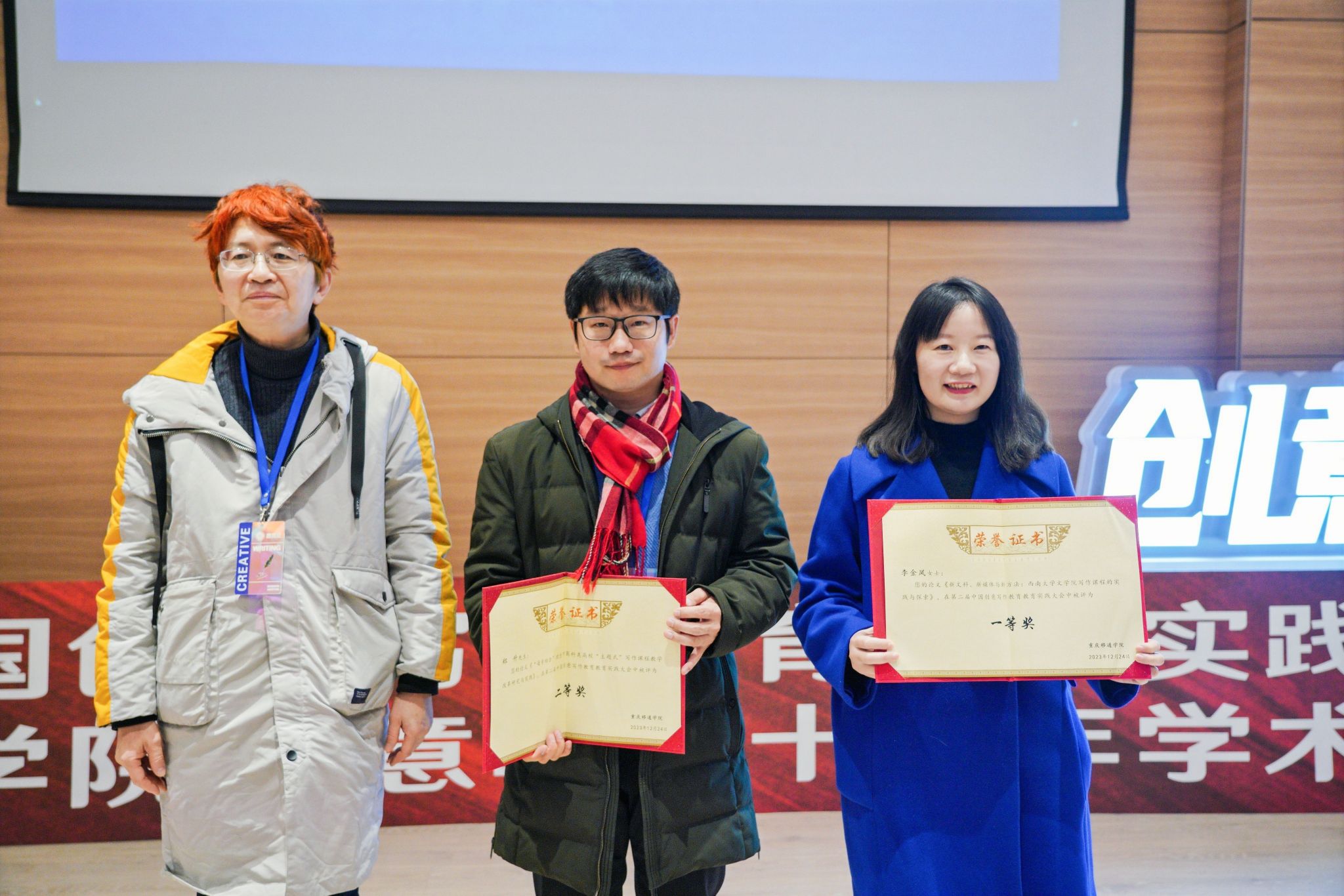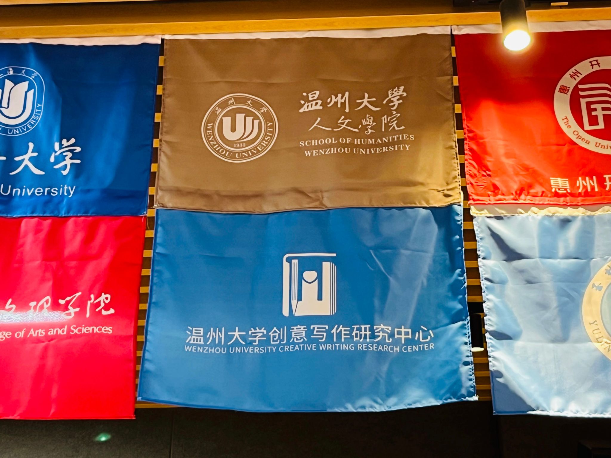 2023年12月23-24日,第二届中国创意写作教育教学实践大会暨重庆移通学院创意写作十周年学术研讨会在重庆移通学院合川校区隆重召开。来自上海大学、复旦大学、中国人民大学等40余所高校的100多位专家学者齐聚山城。德赢ac米兰官方合作vwin的李广旭博士和刘卫东博士作为温大代表以线下线上的方式出席了本次盛会,并在大会上展示了德赢ac米兰官方合作vwin创意写作教研成果,将德赢ac米兰官方合作vwin和德赢ac米兰官方合作vwin创意写作研究中心的两面旗帜悬挂在了会场。