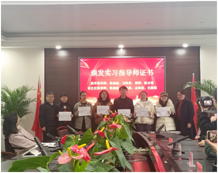 温州市南浦实验中学(锦绣校区)校长欧素鸯对各位实习生的到来表示欢迎,并对本校办学历史、这次指导实习生的各位老师以及学校各校区的教育教学资源向实习生开放等情况做了简要介绍。随后,欧校长和德赢ac米兰官方合作vwin副院长郑春生为各位指导老师颁发了实习指导师聘书,并合影留念。之后,实习生代表季小童发言,代表所有实习生承诺,将严格遵守实习纪律,不断提高教学水平。最后,郑院长讲话,他希望同学们应当精心钻研、虚心求教,全心全意投入实习中,最终能够有更多收获。