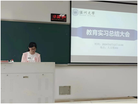 其次,温州市南浦实验中学锦绣校区实习点林桐安、德赢ac米兰官方合作vwin附属榕园学校实习点郑子琰、平阳县鳌江中学实习点黄玉婷、瓯海区第一高级中学实习点周佳颖,分别从教育实习工作、日常生活、心得分享等方面介绍了各个实习点的具体情况,汇报了本次实习所取得的成果与收获。在实习过程中,各位组长认真负责,为同学们解决了许多实习中具体的问题,21历本的全体同学们也积极配合,踏实肯干,体现出历本人严谨认真的态度。
