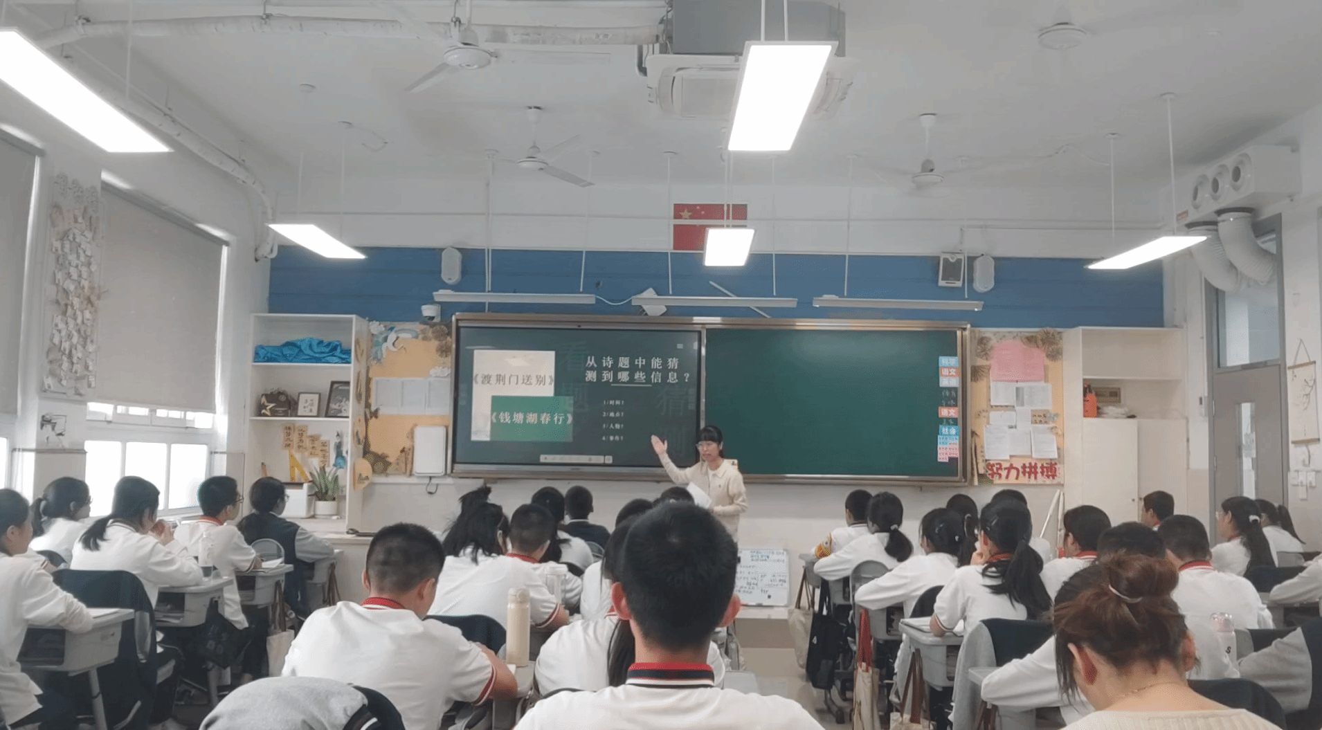汇报课上,董苗苗作为实习生代表,以《唐诗五首》中的《渡荆门送别》《钱塘湖春行》两首诗歌进行了教学展示。经实习点指导师和高校指导师共同指导、改进后的诗歌联讲课,以轻松活泼的课堂氛围、诗意满满的教学模式让大家耳目一新。在这里,大家看到的是师生之间建立在互相尊重、信任、平等的基础上,以两首古诗词为文本而进行的精神上的双向交流、沟通与理解;看到的是师生互动配合的默契,是学生领会了诗文的会心的微笑,是集体备课磨课后呈现出的教学艺术。以下从两个方面记述本次活动内容。