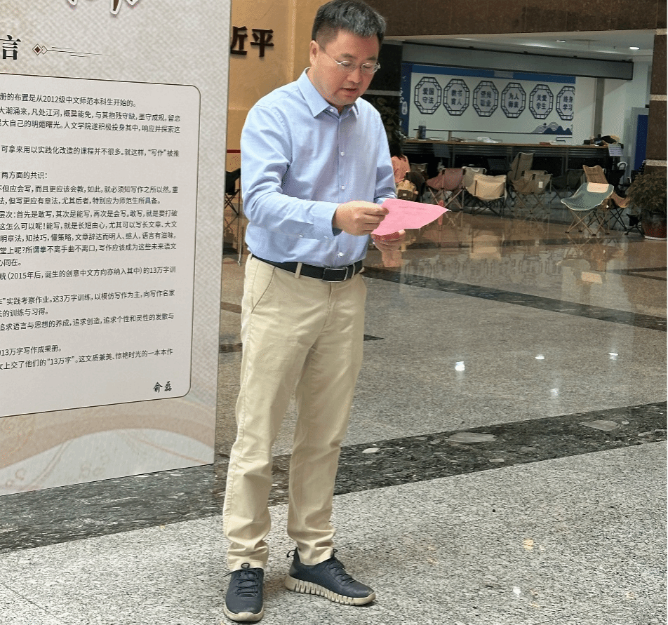 教师代表、中文系副主任李广旭发言。李老师详细地分享了温大写作实践过程中的种种摸索,让与会师生们对学校在写作教学方面的探索与付出有了更深入的了解。李老师指出,在主讲写作课程的俞磊老师的倡议下,学院领导给予了大力支持,于中文系设计了13万字的写作实践。这也是创意写作的温大模式的起点标志之一。