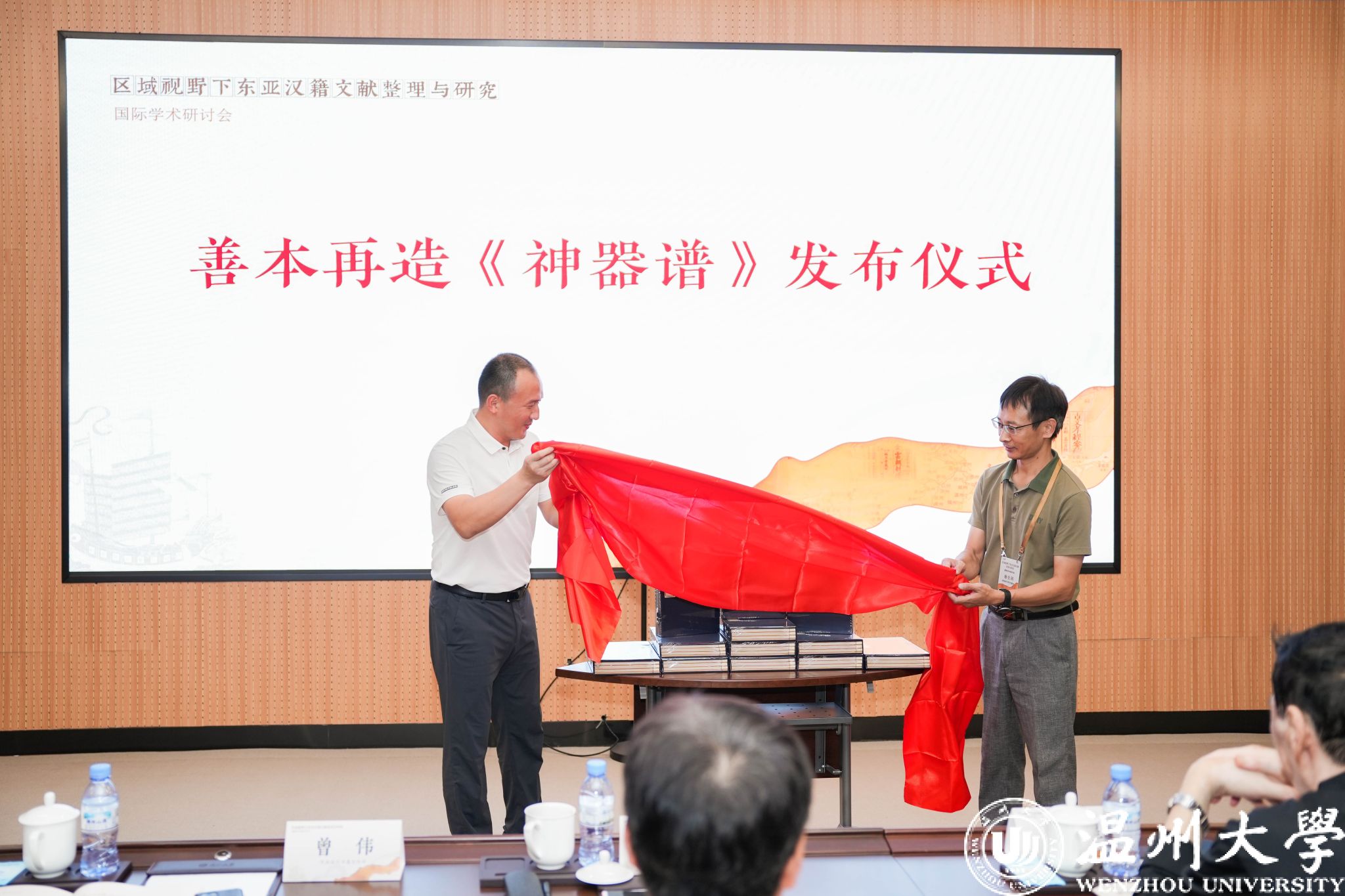 会上,由国家图书馆出版社出版的《温州大典》再造善本系列第二种《神器谱》举行发布仪式。德赢ac米兰官方合作vwin副编审、《温州大典》编辑部主任方韶毅介绍了明代温州籍军事家赵士桢所著《神器谱》版本及仿真书制作情况,温州市委宣传部副部长曾伟、国家图书馆出版社副总编辑廖生训、德赢ac米兰官方合作vwin古籍所所长侯荣川共同参与了交书、赠书。