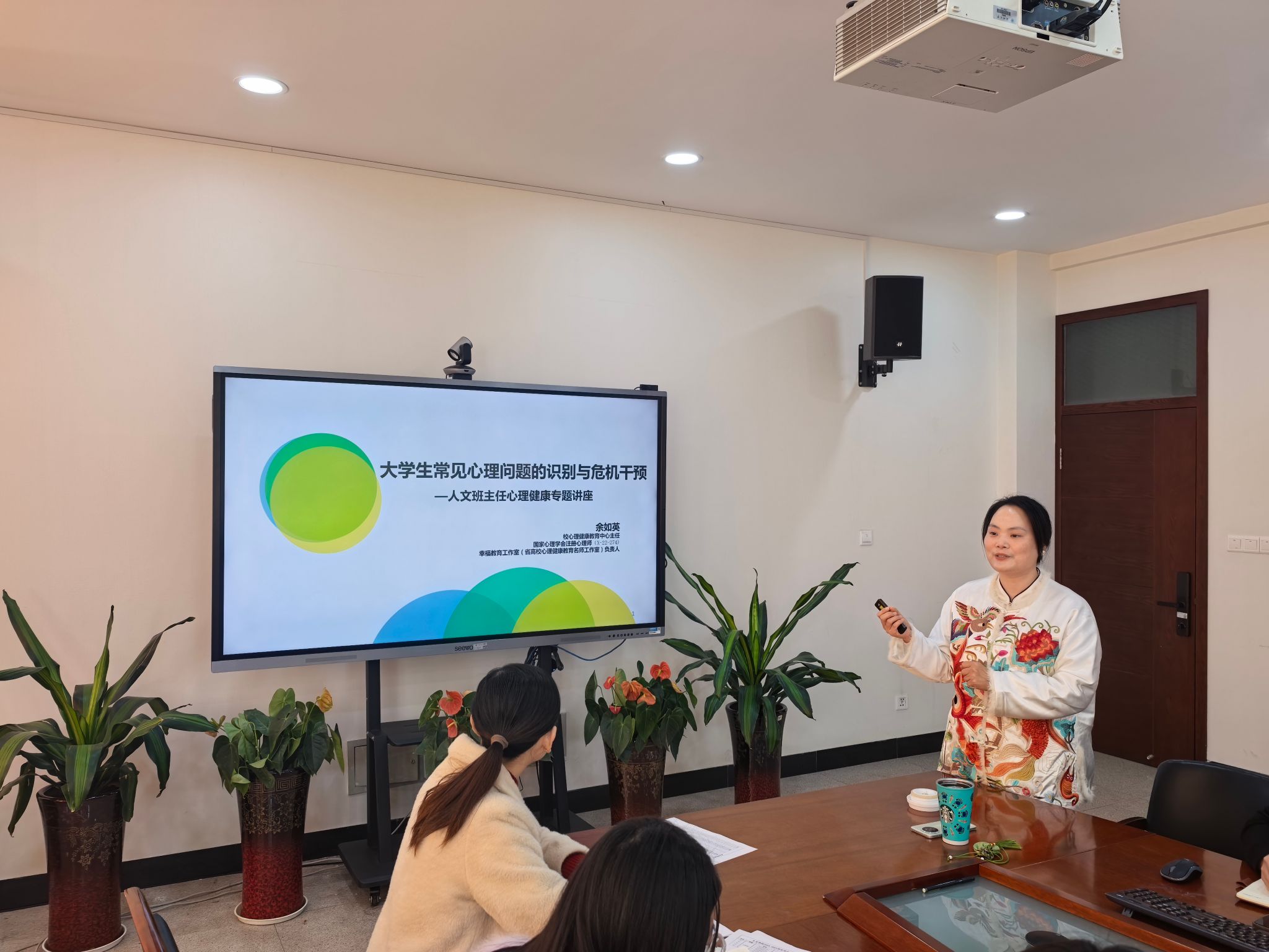 余老师作了《大学生常见心理问题的识别与危机干预》班主任心理健康专题讲座。她从当前大学生的普遍状态讲起,结合大学生常见心理问题的识别、心理健康状态的程度划分,并结合详细案例对走火入魔型、经脉尽断型以及外伤侵袭型做了详细讲解,指出青少年高危事件很难“清零”,但有迹可循,更有策可施。