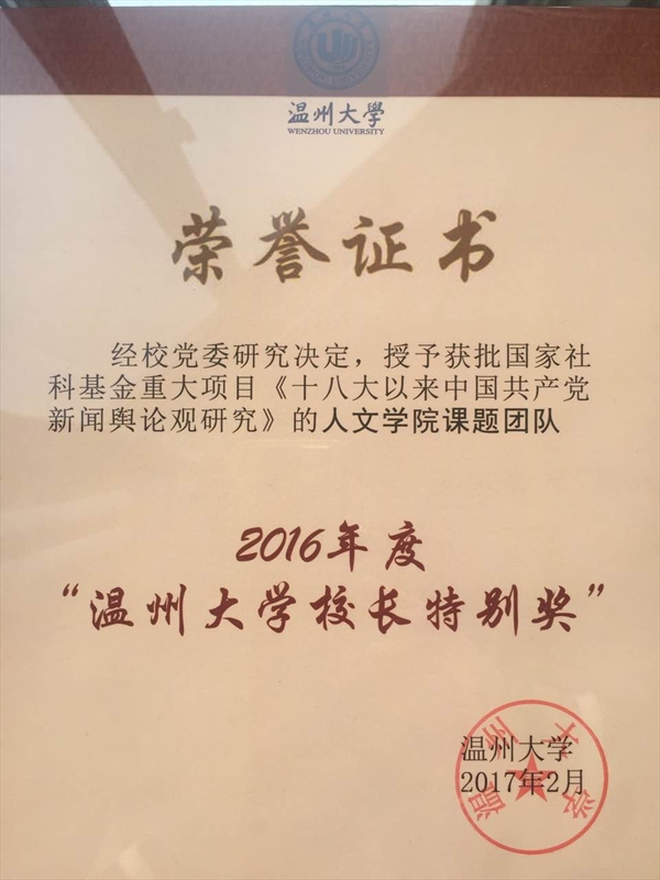 根据校党委会研究决定,德赢官网国家社科基金重大项目《十八大以来中国共产党新闻舆论观研究》的课题组团队荣获2016年度“德赢ac米兰官方合作vwin校长特别奖”。