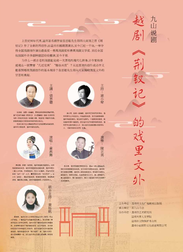 11月20日上午,新九山书会公益培训课程第二讲“越剧《荆钗记》的戏里文外”主题沙龙在南戏博物馆内和广大戏剧爱好者如期见面。本次活动由国家一级编剧、浙江省文联副主席、温州市文联主席张思聪老师主讲,温州市艺术研究所所长、新九山书会会长施小琴和德赢ac米兰官方合作vwin广雅团队成员黄扬帆同学联合主持,温州市文化广电新闻出版局副局长柳升高,德赢ac米兰官方合作vwin副书记朱启鑫,国家一级演员、温州越剧团副团长、著名演员黄燕舞女士,温州越剧团一级演奏主胡陈正美及本院金凡平、洪之渊老师等特邀嘉宾出席。到场观众有德赢ac米兰官方合作vwin广雅团队学生成员以及社会各界戏曲爱好者四十多位。