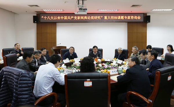 3月19日上午,“十八大以来中国共产党新闻舆论观研究”国家重大招标课题选题方案专家咨询会在南校岩松堂展示厅顺利召开。出席会议的专家有领衔选题方案设计的南京大学丁柏铨教授,以及复旦大学资深教授、志德书院院长、新闻学院童兵教授,中国新闻学会会长、中国人民大学新闻学院郑保卫教授,北京大学新闻传播学院院长陆绍阳教授、华中科技大学新闻与信息学院院长张昆教授,解放军南京政治学院军事新闻传播系主任蔡惠福教授,郑州大学新闻与传播学院董广安教授等。咨询会由副院长夏雨禾教授主持,副校长赵敏教授,校党委委员、党委宣传部部长潘玉驹教授,院长蔡贻象教授和人文社科处副处长陈宝胜副教授以及德赢ac米兰官方合作vwin部分教师出席了会议。