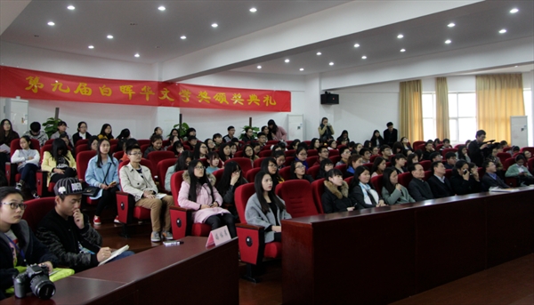 颁奖典礼简洁又隆重。首先通过一段视频,我们回顾了白晖华文学奖从无到有,一路走来的历程,还有获奖者对这个奖项意义的解读。接着由学生代表向吴明华先生献上鲜花表达敬意之情,吴先生也跟大家讲述了自己的创作故事以及创作心得,并鼓励文学爱好者们永远保持自己的创作激情,为自己的文学梦想而努力。随后获得一二三等奖以及鼓励奖的同学上台领奖,嘉宾为他们颁发了奖项。学生代表骆雪娟和徐清海朗诵了获奖诗歌《一个女人一个深渊》和《岳阳楼记》,与在场所有文学爱好者共同欣赏这两篇优秀的诗歌。然后获奖代表王一莉同学上台发言,分享了自己四年来对白晖华文学奖的感情以及白晖华文学奖对她伯乐一般的重要作用,多次获奖的经历也给了她极大地鼓舞和支持,促使她笔耕不辍,不断向前。最后校党委宣传部部长潘玉驹上台总结发言,首先代表德赢ac米兰官方合作vwin对吴先生数年来无私的支持与奉献表示感谢,同时向获奖同学表达了祝贺并对同学们寄予厚望,也希望青年作家们能够依托温大厚重、悠久的校史创造出优秀的文学作品。最后潘部长还提醒同学们,写作要以丰富的人生体验为基础,拓宽作品的深度和广度,只有这样才能让文学之花充分绽放。