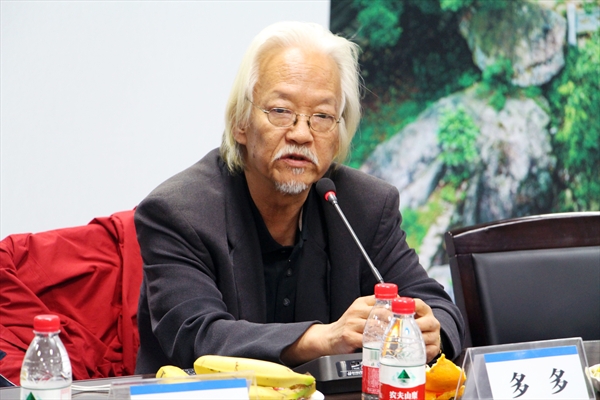 诗人多多受邀作第一个发言。多多以自己第一次看到雪山便流下了眼泪为例,表达出了他对于山水的那种终身难忘的感觉。中国的道家文化中热爱大自然的情怀是世界所公认的。虽然多多自己并未写过真正的山水诗,但是他几乎每一首诗中都离不开大自然的意象。多多说:“我们与大自然的关系,不是一种对象的关系,也不是一种观察者与被观察者的关系,而是一种爱,一种从未想过要离开,以后也一直会在一起,永远不分开的关系”,充分表达出诗人对于大自然的毫无保留的热爱。多多同时也谈及了现代诗歌与传统诗歌的区别,“语言自动敞开,诗歌自动到来”,现代诗歌的核心就是语言的言说,要不然就还是传统诗歌。