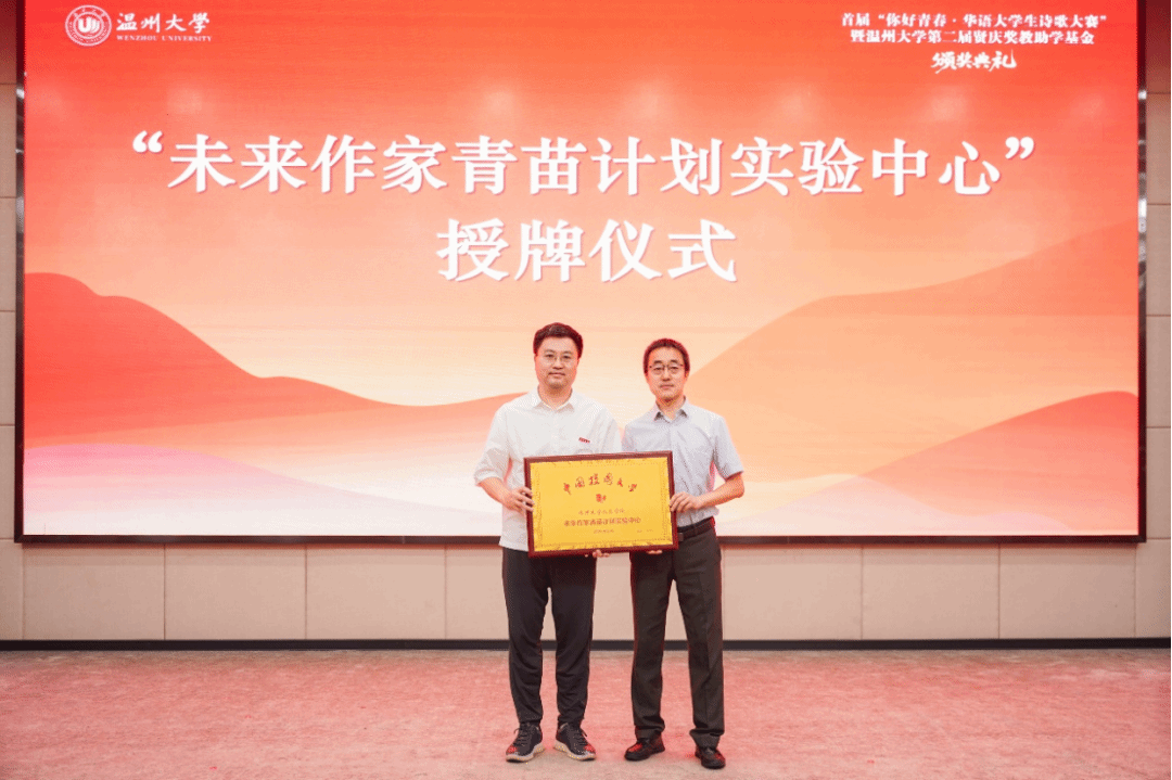 徐峙先生与德赢ac米兰官方合作vwin孙良好院长共同揭牌“未来作家青苗计划实验中心”,为热爱文学创作的学生提供更广阔的发展平台,助力校园文学人才培养。受邀嘉宾纷纷上台,为第二届“你好青春·华语大学生诗歌大赛”的正式启动按下手印。