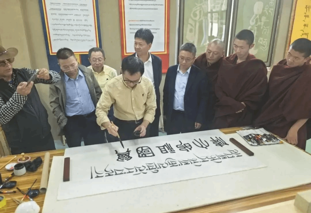 德赢ac米兰官方合作vwin校友诗社副社长、温州市书法家协会副主席陈胜武与壤塘藏文书法家进行了现场书法交流藏汉文书写伟大的祖国万岁