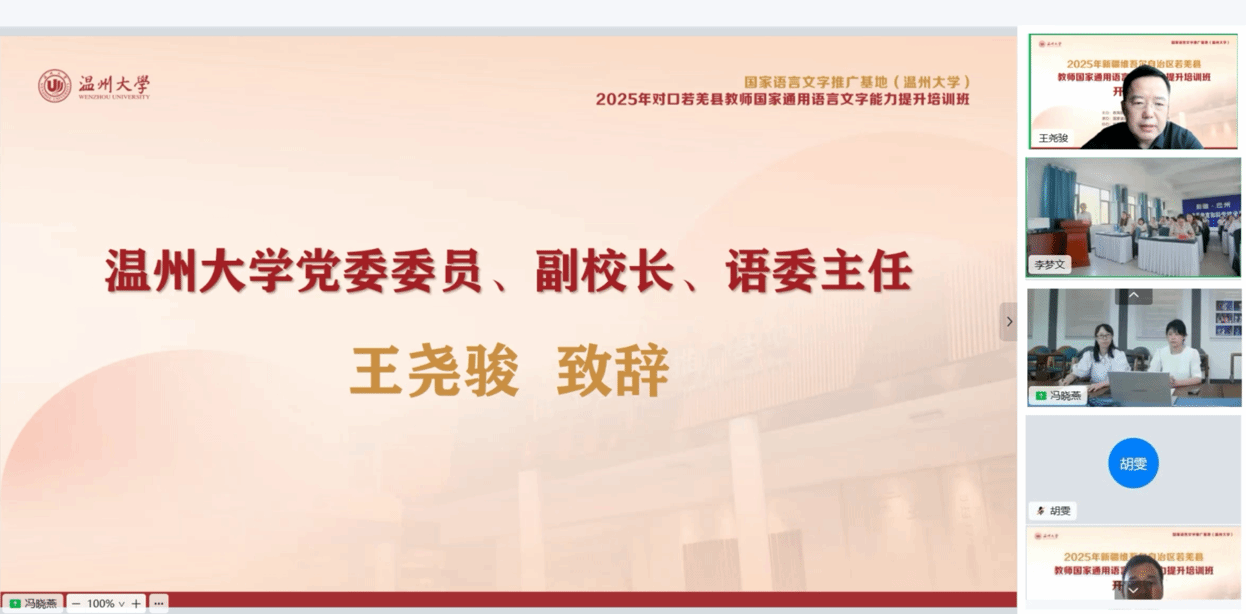 为深入贯彻落实《教育强国建设规划纲要(2024—2035年)》,加大国家通用语言文字推广力度,铸牢中华民族共同体意识,8月12日,由教育部语言文字应用管理司主办、国家语言文字推广基地(德赢ac米兰官方合作vwin)承办、新疆若羌县教科局协办的2025年对口若羌县教师国家通用语言文字能力提升培训班举行开班仪式。