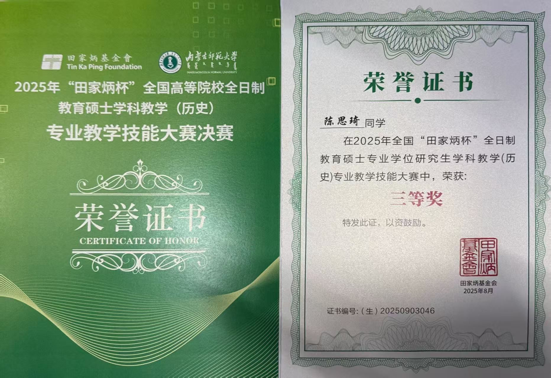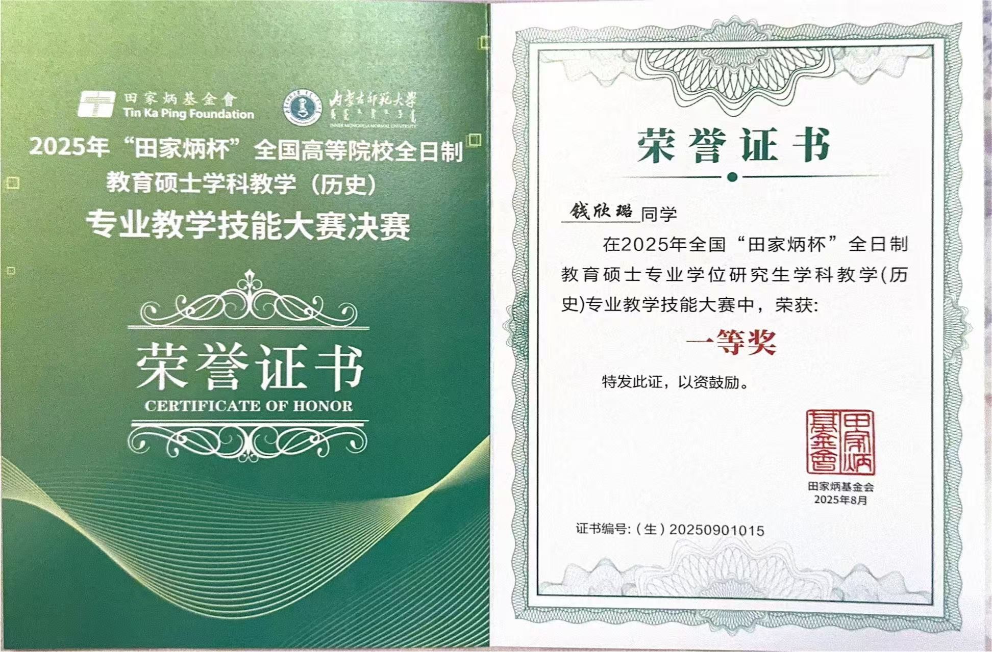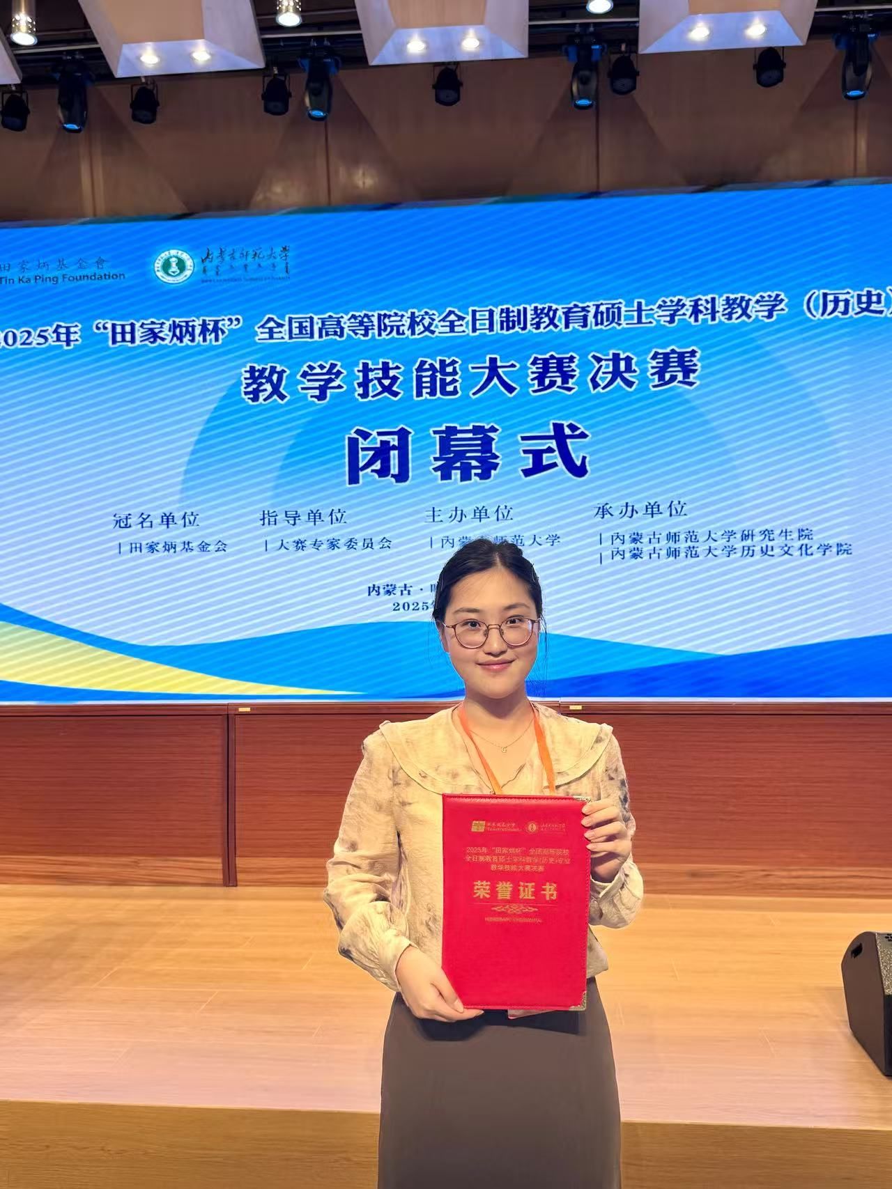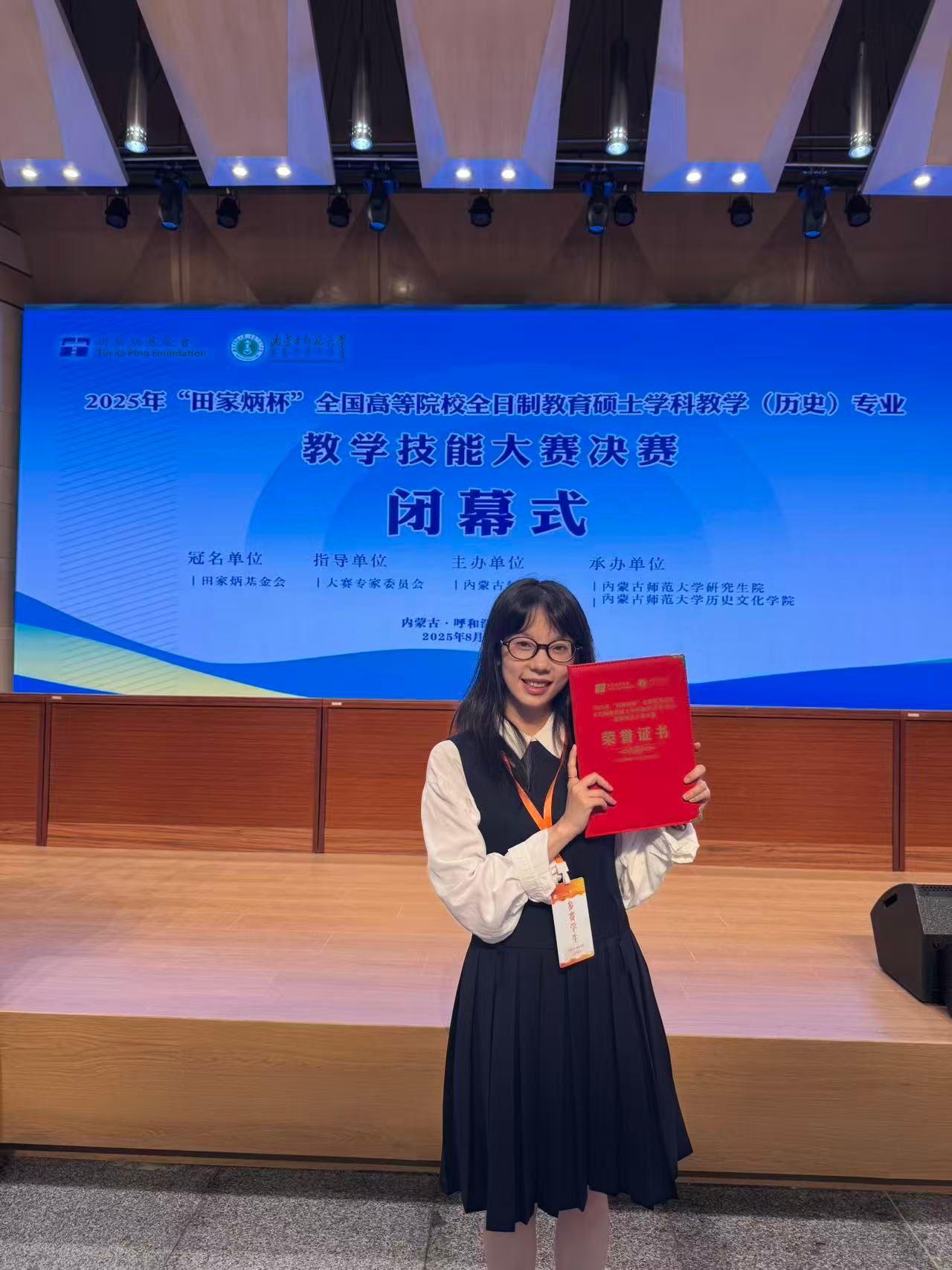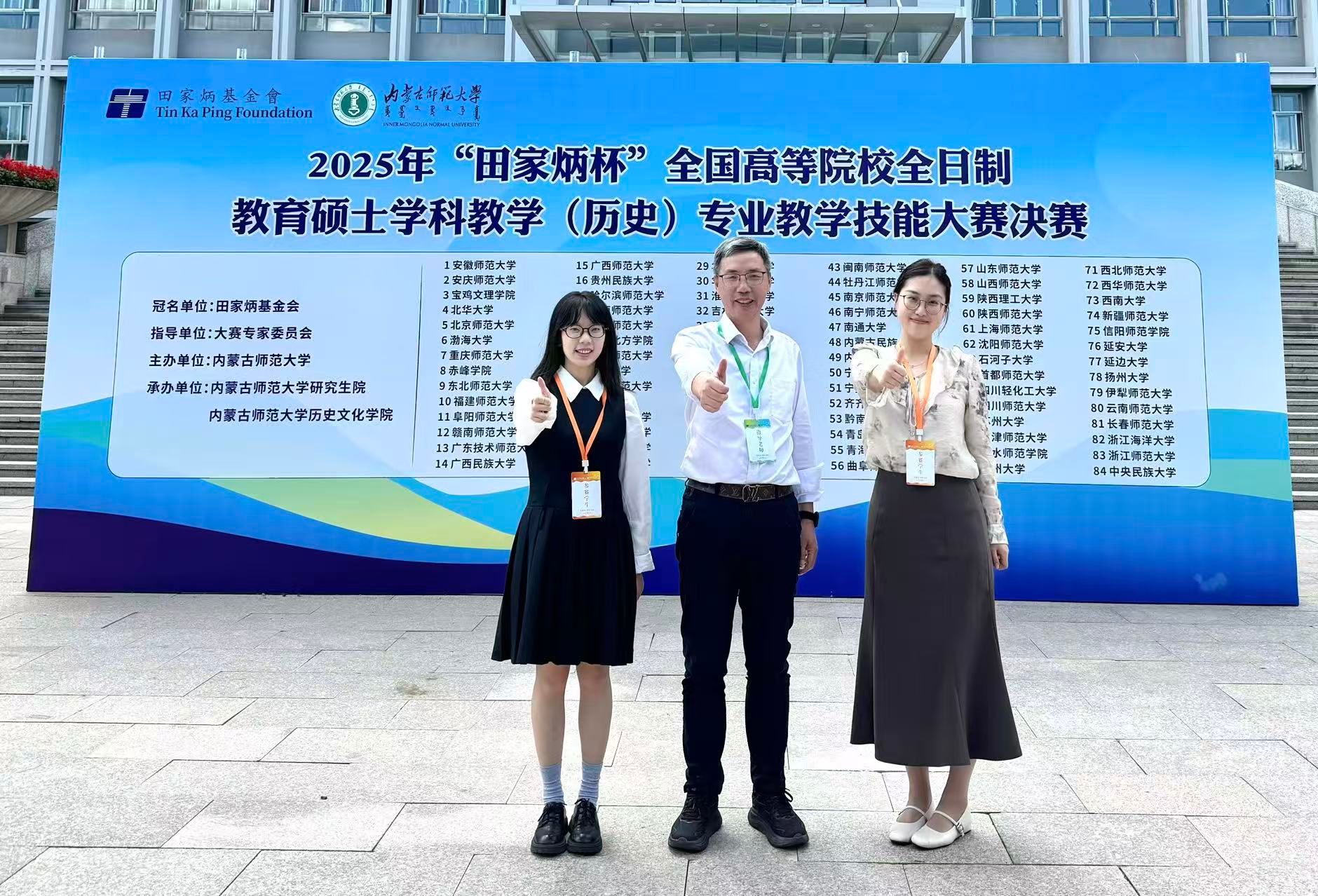 2025年8月22日至26日,2025年全国 “田家炳杯”全日制教育硕士专业学位研究生学科教学(历史)教学技能大赛决赛在内蒙古师范大学举行。该项赛事由全国教育硕士专业学位指导委员会指导,田家炳基金会冠名,内蒙古师范大学主办,吸引了来自北京师范大学、华东师范大学、华中师范大学等全国84所高校的160余名选手参赛。德赢官网历史系学科教学(历史)研究生由蒋金崇教授带队参赛,并在决赛中取得优异成绩,23级研究生钱欣璐、24级研究生陈思琦分别荣获一等奖和三等奖,祁刚博士获“优秀指导教师”奖。