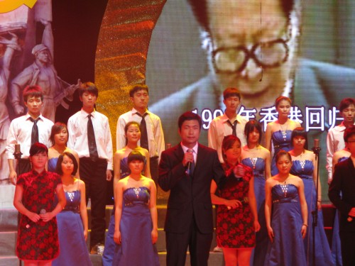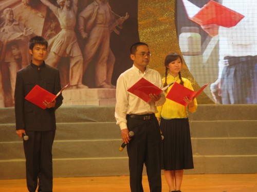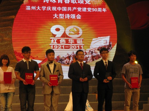 开幕式后举行“诗咏青春歌颂党”建党九十周年大型诗歌朗诵会,全校来自二级学院及部门选送十个朗诵节目恢弘演绎咏志情怀。德赢ac米兰官方合作vwin选送的群颂《我的祖国》以飒爽的英姿亮相舞台,在场师生掌声不断,来自德赢官网的80名学生代表高呼“文韬武略,扬我人文”,充分展示了人文学子的良好精神风貌。最后校党委书记陈福生、副书记林娟娟与德赢官网党总支副书记骆锤炼老师等全校师生代表共同演绎原创诗朗诵《党建纪元逾九十 歌颂党史唱温大》,令全场激情澎湃、荡气回肠,晚会达到高潮。大会在全场起立齐唱校歌的庄严氛围中,将爱党荣校的精神“润物细无声”深植入了全体温大人的心中。在上周三上演的庆祝建党九十周年诗歌朗诵大赛中,《我的祖国》获得群诵组第二名的好成绩,同时也荣获了“优秀创作奖”奖项。