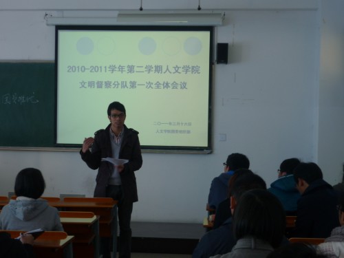 3月16日下午1:30,2010-2011学年第二学期德赢ac米兰官方合作vwin文明督察分队第一次全体会议在1-105教室准时举行。此次会议由德赢ac米兰官方合作vwin团委组织部负责,辅导员麻法全老师出席,文明督察队的各成员参加。