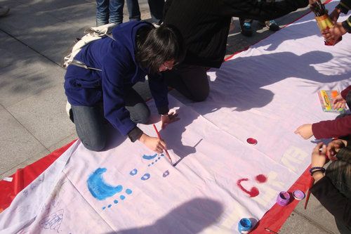 作为中国共产党领导下的一次大规模学生爱国运动,“纪念一二•九”精神值得大学生学习。本次的“纪念一二•九”涂鸦活动中,由各班派出的代表们一齐在洁白的横幅上以“纪念一二•九”为主题画出自己的风格,画出自己的个性。将近一个小时的作画过程精彩纷呈,同学们各展才能,横幅上不同的绘画作品因着共同的主题而形成一个和谐整体。