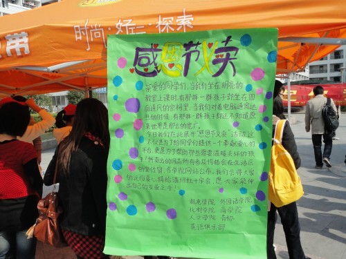 2010年11月25日12点至16点30分,德赢ac米兰官方合作vwin、商学院、机电工程学院、化材学院四个学院的青年志愿者协会以及英语俱乐部在温大C区凉亭共同合作开展“感恩节义卖”活动。