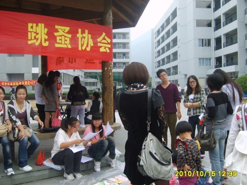 在活动开始的前一天,协会的会员就已经做好了充分的准备,他们两三人一组,进入各个寝室进行宣传造势并收集学生们要出售的二手物品,并在C区宣传栏张贴海报。10:40,协会的理事、干事就已就位,会长开始分派任务。然后活动就正式开始。陆续有同学参与进来。他们凉亭附近的地上摆开了"地摊",试着招揽生意。由于前天的有效宣传,交易的物品颇丰,有各种衣服、裤子、书本、学习用品等。会员们扮演了一回摊主的角色。像模像样地与买主讨价还价。有的会员负责收钱、签收交易协议、盖章。慢慢地,越来越多的人开始注意到我们的活动,饶有兴趣的搜寻自己感兴趣的物品,更有学生客串卖家,活动达到高潮。14:00,活动结束,围观的人群才渐渐散去。