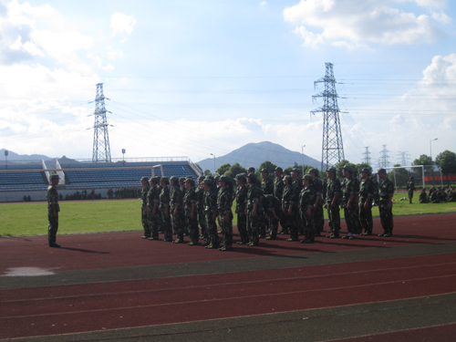 9月8日上午8点,德赢ac米兰官方合作vwin全体09届学员在南校区和北校区的体育场继续进行为期六日的军事训练。来自温州武警支队的教官带领同学们进行操练。