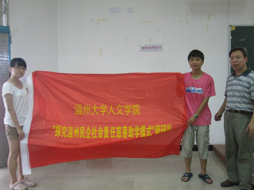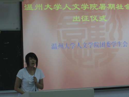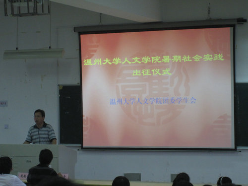 本次出征仪式共有四大议程。首先,辅导员麻法全对德赢ac米兰官方合作vwin历年来进行的暑期社会实践活动作了基本介绍并给予大力肯定。接着院党总支书记周剑平进行了暑期社会实践活动的动员讲话,着重强调了活动中需注意的人身、财产安全问题。之后,由院实践队代表罗倩倩发言,讲述了她对暑期社会实践活动的感受与期待。最后进行的是院重点团队的授旗仪式,院党总支书记周剑平分别为“探究温州民企社会责任慈善助学模式”、“寻找逝去的古城”及“探寻泰顺特色文化”暑期社会实践队授旗。