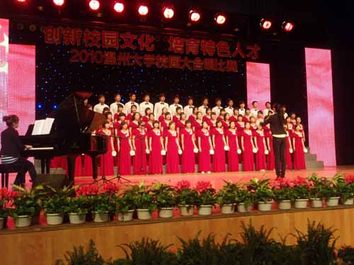 首先,陈福生书记和牟德刚教授围绕校园文化建设主题发表了重要讲话。之后,合唱比赛正式开始。来自各学院的十八支参赛队伍依次进行表演,并由专业人士组成的评委团打分。比赛曲目共包括指定曲目和自选曲目两部分,其中指定曲目多为脍炙人口的经典红歌。德赢官网第一个登台演出,参赛曲目为《歌唱祖国》和《瑶山夜歌》。经过两个多小时的激烈角逐,比赛圆满结束。教师教育学院、瓯江学院及研究生部荣获一等奖。德赢官网获三等奖。