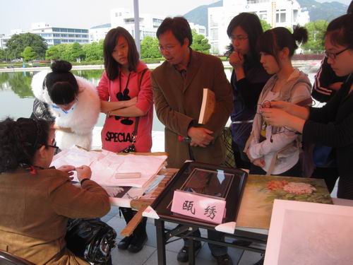 温州具有悠久的历史,从东晋明帝太宁元年建城开始至今已有1700多年的历史了。温州向来有“七山二水一分田”之说,这样的地理环境也为温州赢来了“百工之乡”的美称。近年来温州很多工艺都成了“全国非物质文化遗产”。本次活动由于很多美术家的参与,吸引了很多大学生的兴趣。本次活动在德赢ac米兰官方合作vwin北校区人工湖畔展开,现场热烈非凡,同学积极参与。大家怀着极大地好奇心在各个展柜前参观、学习并亲自实践。现场有道情表演、提线木偶和舞龙表演等,引来大家阵阵掌声。活动现场还有现场教你学剪纸的活动项目,许多同学都跃跃欲试,两百份红宣纸在同学手中很快都成了艺术品。