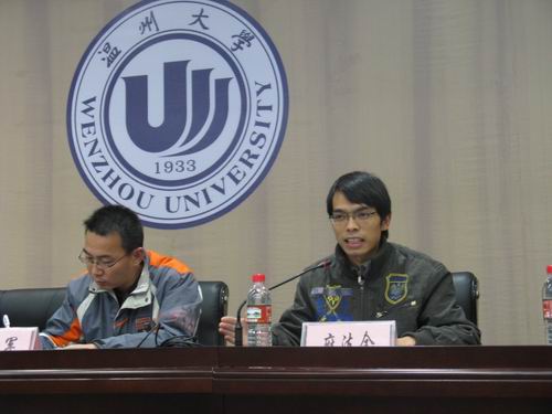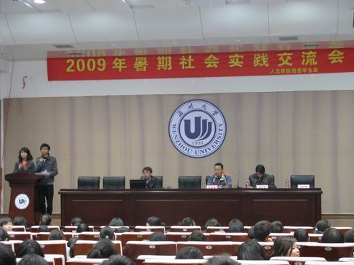在观看了一段“教育时空”有关温大德赢ac米兰官方合作vwin2009年暑期社会实践的专题报道视频后,交流会正式开始。首先,麻法全老师向同学们介绍了2009年暑期社会实践活动的情况,并展示了各实践队的成果和心得感悟。而后,由主持人吴婕和院十佳歌手冠军郜波为大家带来优美的歌曲演唱《被风吹过的夏天》后,活动进入游戏环节。小游戏充分带动了在场同学的情绪,活动气氛渐渐热烈。接下来的交流活动以诗为名,别具一格。“小荷才露尖尖角”通过让大一同学对09社会实践图片的印象实践感悟和创意命名令同学们体会到了大学生对社会的责任感和关怀。“映日荷花别样红”的环节中,大一同学们尽情畅想将来暑期社会实践的计划,并由麻法全老师作出精彩的评点,提出中肯的建议。"道是无晴却有晴",各优秀暑期社会实践队的队长依次上台进行PPT成果展示,让大一同学感受到了真实的暑期社会实践生活。最后,冯建军老师和麻法全老师为本次活动作总结发言。