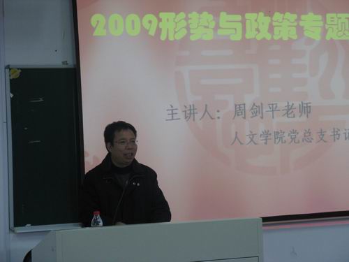 12月9日下午1点30分,2009形势与政策专题讲座在北校区203教室举行,本次讲座由德赢ac米兰官方合作vwin党总支书记周剑平老师主讲。德赢ac米兰官方合作vwin大一全体学生参加了讲座。