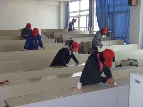 活动开展之前,人文思源青协的负责人与主办方做好了充分地沟通和准备工作,向主办方领取了已准备好的香蕉水、一次性手套和抹布等工具,同时根据学院教室的具体情况做好了志愿者的招募工作,共招募了20名志愿者。活动开始后,志愿者在工作人员的组织安排下,先领取了活动用具,然后到各个教室进行清理工作。志愿者的活动热情非常高,大家克服了香蕉水刺鼻的气味,在各个教室认真地清除课桌上的“文化”。有些课桌的涂鸦现象特别严重,志愿者不辞辛劳地进行多次擦洗,终于还原了课桌原来的面貌。随后志愿者又对各个教室进行了整理,打扫卫生、整理讲台,整个活动持续了近两个小时。在志愿者的努力下,课桌变得干净美丽,教室显现出了崭新的面貌。