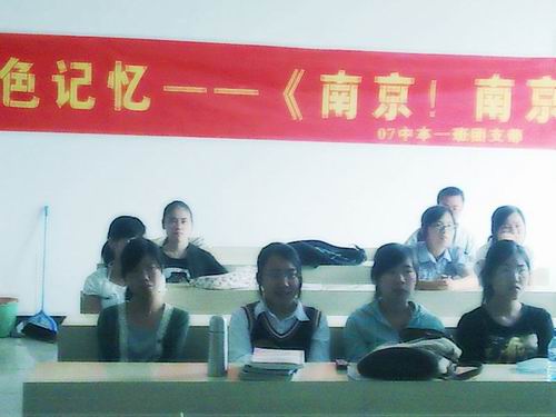 影片《南京!南京!》以一个全景的视角再现了“南京大屠杀”这段历史。07中本一班同学怀着悲痛的心情观看了这部影片。面对“南京大屠杀”这个中国历史上至今还悬而未决的空前惨案,同学们心中感慨万千,有对遭受残害的30多万同胞的深切悼念,有对日本军国主义的强烈控诉,有对这段历史产生的深刻反思。