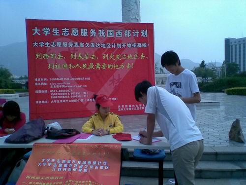 2009年5月4日,德赢ac米兰官方合作vwin校志愿者服务中心与德赢ac米兰官方合作vwin“思源”青年志愿者协会借“五四”这个光荣的日子,在德赢ac米兰官方合作vwinA生活区举行了“两项计划”的宣传活动。“两项计划”主要包括“大学生志愿服务我国西部计划”和“大学生志愿服务我省欠发达地区计划”。本次宣传活动旨在鼓励更多的应届毕业生投身到“两项计划”中去,为祖国建设做出自己的一份贡献。