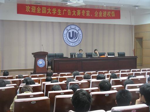 3月20日15:30,由德赢ac米兰官方合作vwin主办的"数码广场杯"暨第三届全国大学生广告艺术大赛德赢ac米兰官方合作vwin预赛特邀讲座--"广告创意与大学生广告大赛",在北校信息楼报告厅举行。本次讲座有幸请到了仙居县农业局农产品质量首席技术推广朱水星专家以及浙江大学广告专业主任胡晓云教授进行讲解指导。